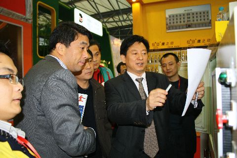在第十五屆中國國際五金博覽會(huì )上,林眾偉(右二)向全國五交會(huì )商會(huì )協(xié)會(huì )工具分會(huì )會(huì )長(cháng)魏勇介紹“鷹之印”。通訊員 攝