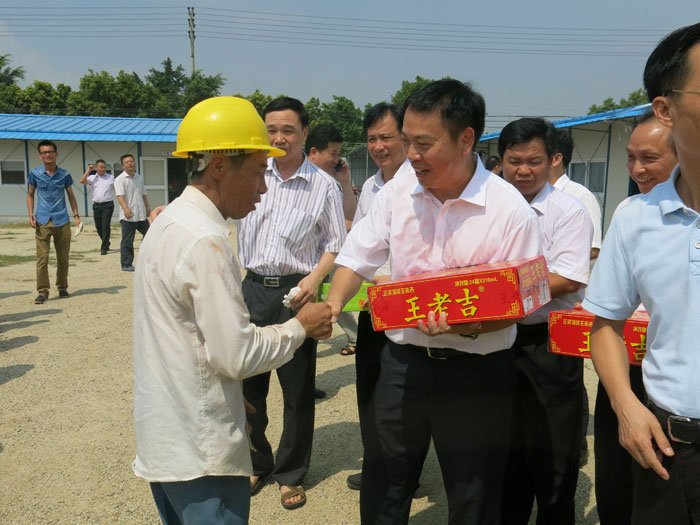 市、區有關(guān)領(lǐng)導向工地職工送上王老吉等解暑飲品