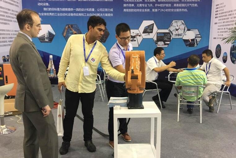 加德偉公司的智能機械臂引起境外采購商的注意。圖為公司參展負責人現場(chǎng)展示產(chǎn)品功能